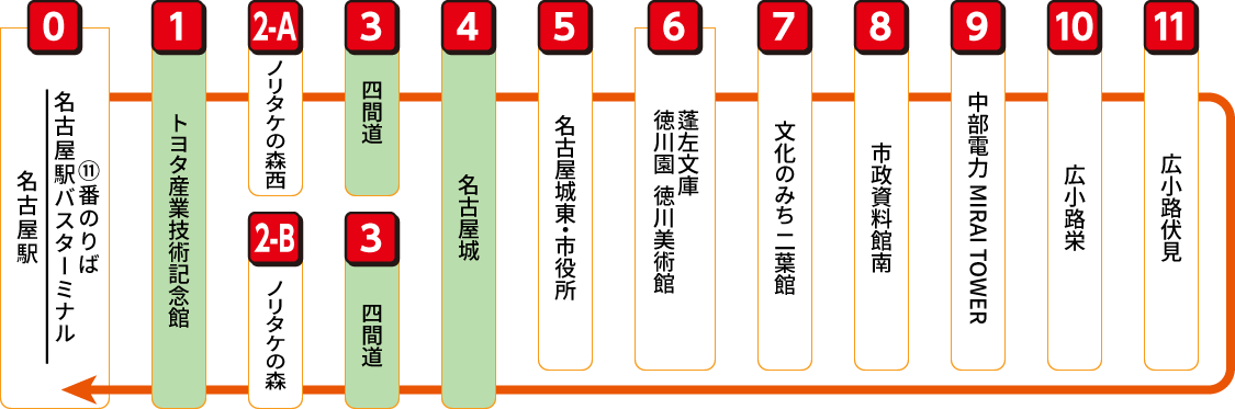 名古屋駅から名古屋城、徳川園など、中心部の人気スポットをぐるっと巡る便利な巡回バスです。