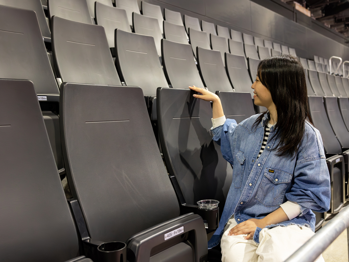 こちらは、一番上の4階にあるスタンド席。ハイバックの背もたれが体をすっぽり包んでくれるので、安心して観戦できます。