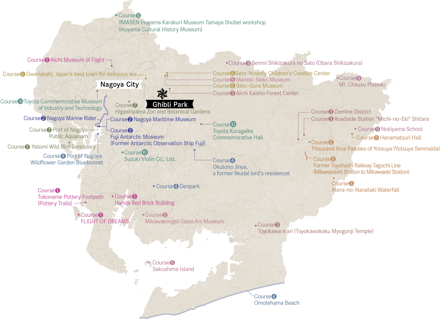 1. Ghibli Park→2. Nagoya Marine Rider→3. Nagoya Maritime Museum→4. Fuji Antarctic Museum (Former Antarctic Observation Ship Fuji)
