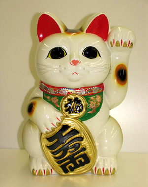 招財貓的造型為一手持橢圓形金幣,與身體大小相同的頭,還睜著可愛圓圓的大眼睛。招財貓的約80%是在常滑這裡製造的。有多種色彩與造型,粉紅色是祈求戀愛運,綠色是祈求考試合格等等的意思。多種顏色的招財貓帶人們繁榮與幸運。