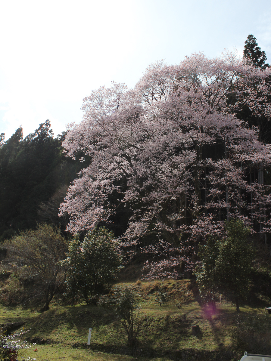 国道473号沿い「きのこの森」を過ぎ、400m程進むと橋があります。その橋を渡り、すぐ右折し、100m程進んだ民家の裏山に圧倒的な存在感ある大きなエドヒガンザクラがそびえます。高さは25m、根回りは3m以上はあり、樹齢は推定80年。国道沿いに目を移すと、樹齢150年ほどの親桜があります。この2本桜は「兄弟桜」とも「親子桜」とも言われます。その昔、同じ所(川沿い)にあった桜を一本分け植えたものだと言われてており、近年では地域の方が周囲を伐採するなどし、整備され、地域のシンボルとして大切に育てられています。