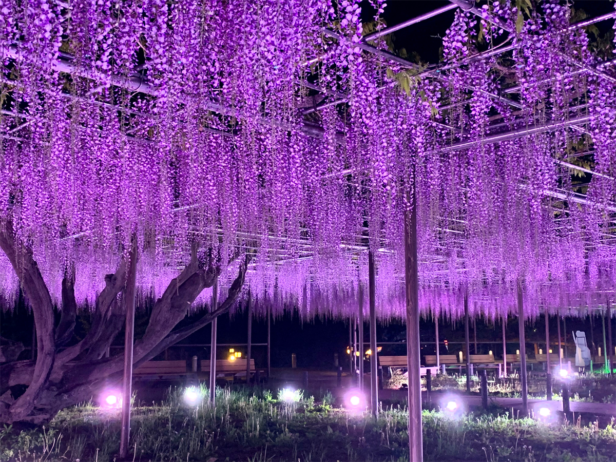 岡崎城公園南側の乙川堤防沿いにある1,300平方メートルの藤棚「五万石ふじ」。花房が長く、見事な紫色の花が広がり、その甘い香りに毎年多くの人が訪れます。