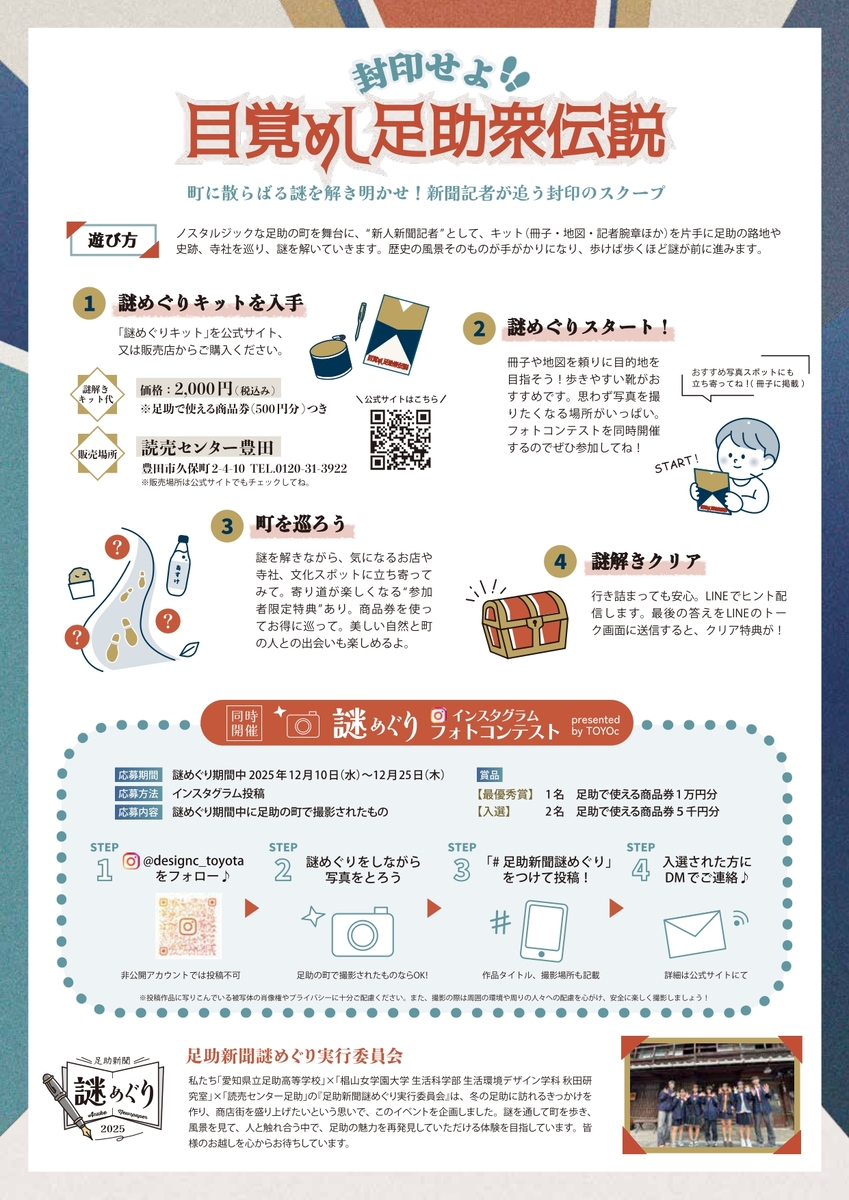 「愛知県立足助高等学校」×「椙山女学園大学 生活科学部 生活環境デザイン学科 秋田研究室」×「読売センター足助」の「足助新聞謎めぐり実行委員会」がお届けする【町歩き×謎解き】の『謎めぐり』イベント。