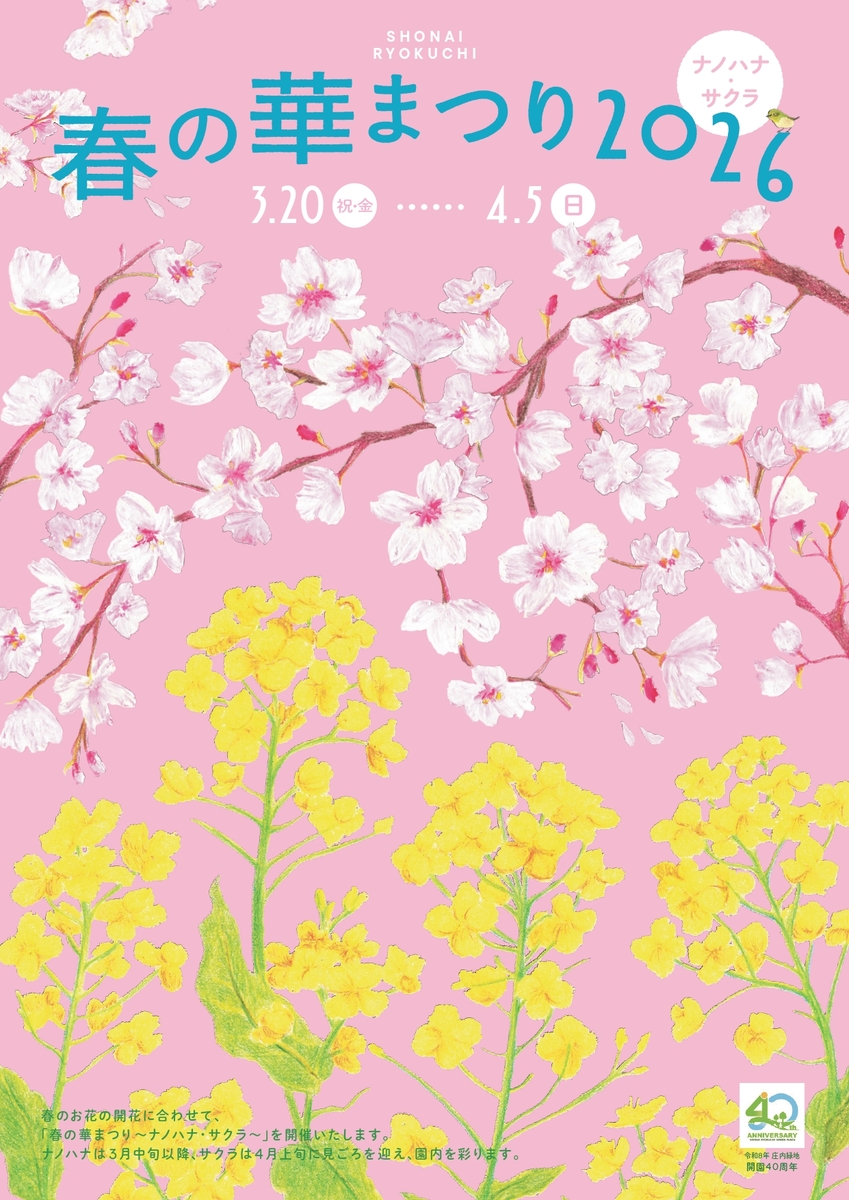 莊內綠地有約20,000棵油菜花和約700棵染井吉野競相開放,分外美麗。