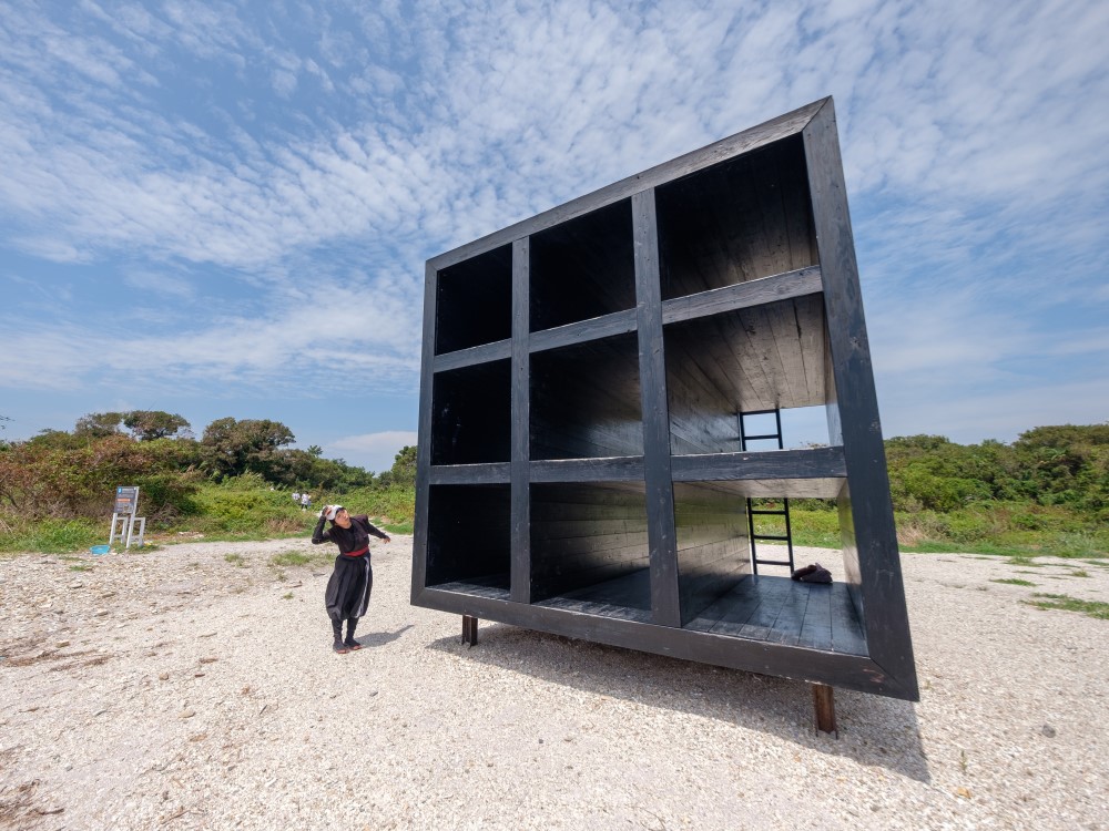 沿着羊肠小道一路到了海边,眼前出现了一个黑色的艺术造型,这就是著名的午睡House了,以人和自然的对话为主题。造型分成9个空间,非常适合午睡,游客不多的时候,在这里躺下,在海风的吹拂中小憩一会,一定非常惬意。它还曾经出现在2010年上映的电影版《名侦探柯南 天空的遇难船》中。