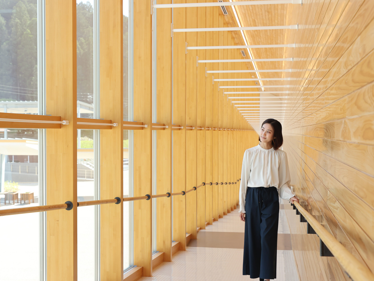 作为建筑外观看点的坡道,大量使用了设乐町出产的桧木,呈现出令人惊叹的建筑美感。