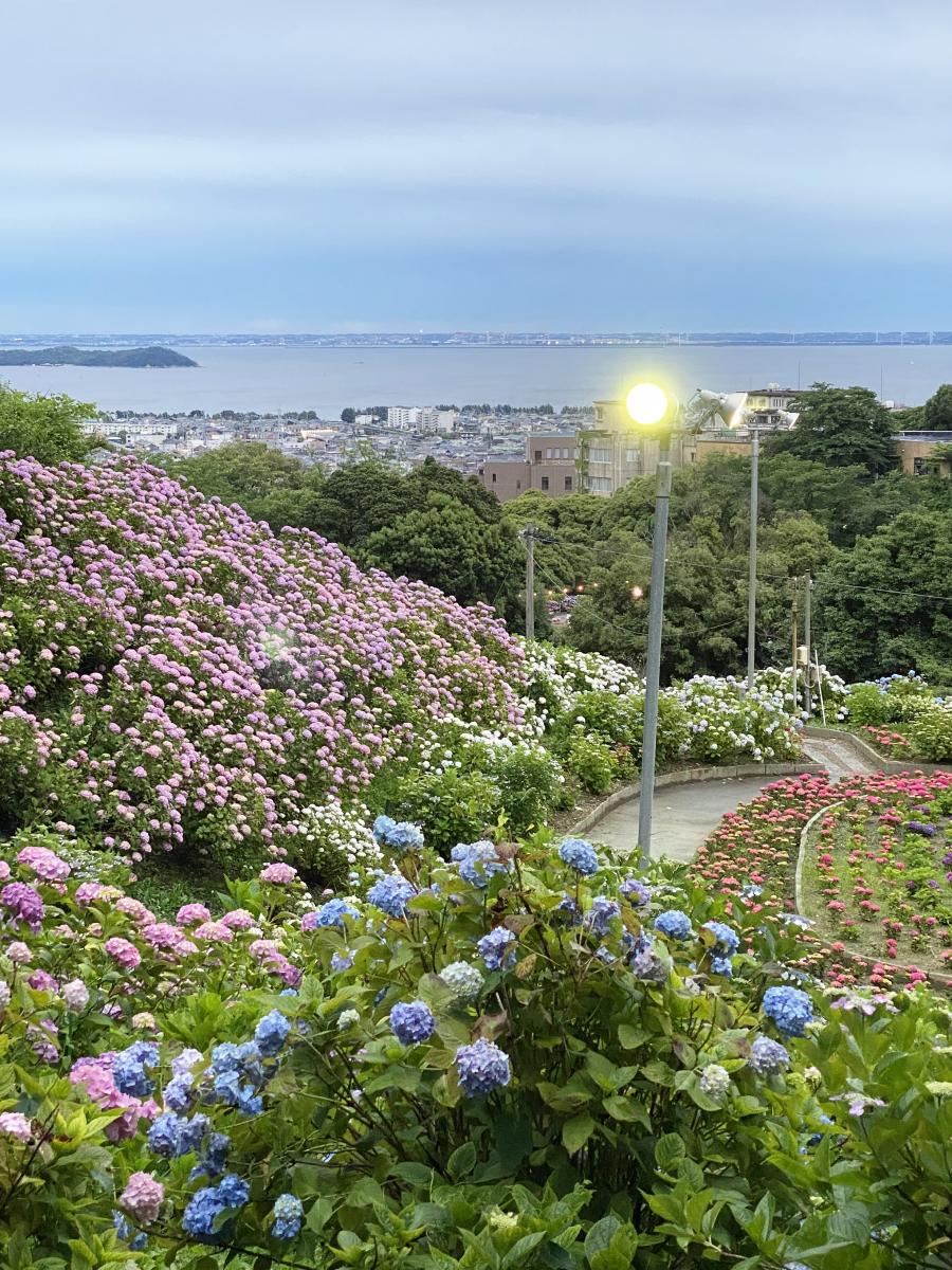 晚上有夜间亮灯,远方的天空和大海与紫阳花搭配在一起非常梦幻、美丽,运气好的话,还能看到生息在紫阳花之乡的源氏萤火虫。
