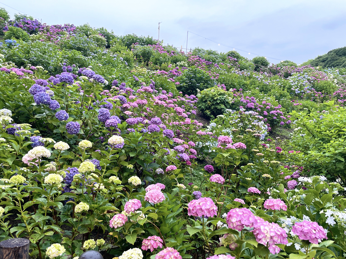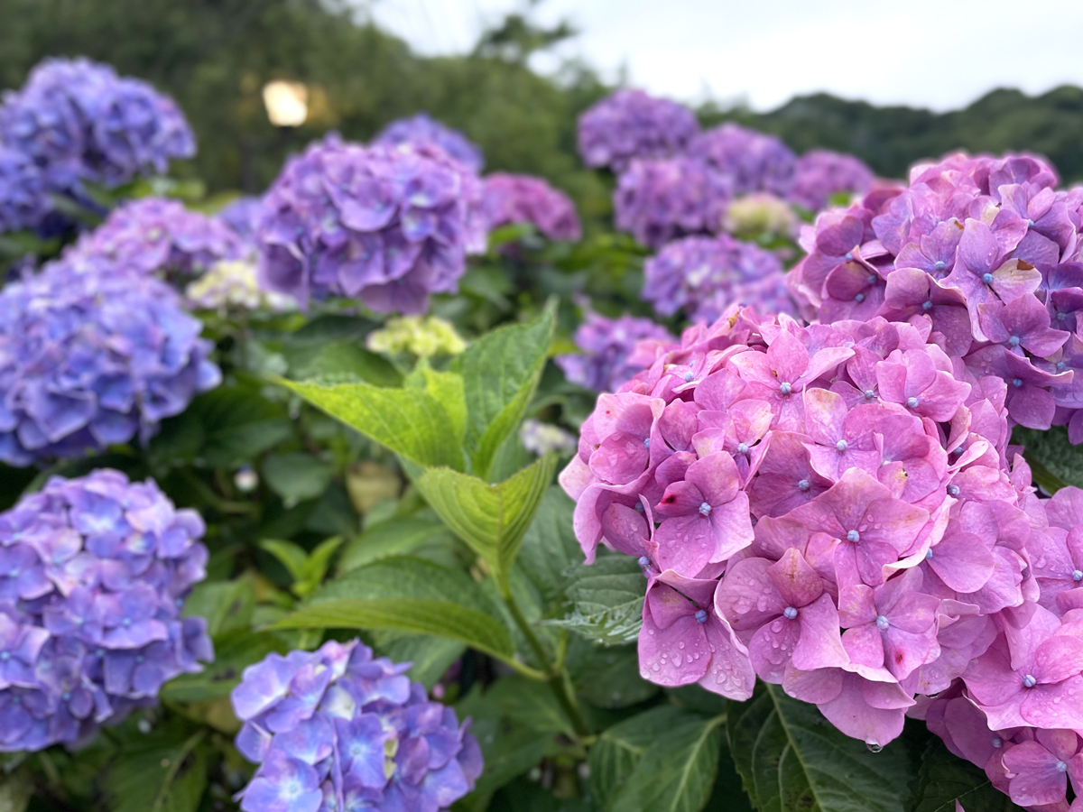 放眼看去全都是紫阳花,非常震撼。拍照也绝美!天气好的日子,鲜艳的紫阳花当然非常漂亮,被雨滴濡湿的紫阳花也别有韵味,雨天也是不错的选择。