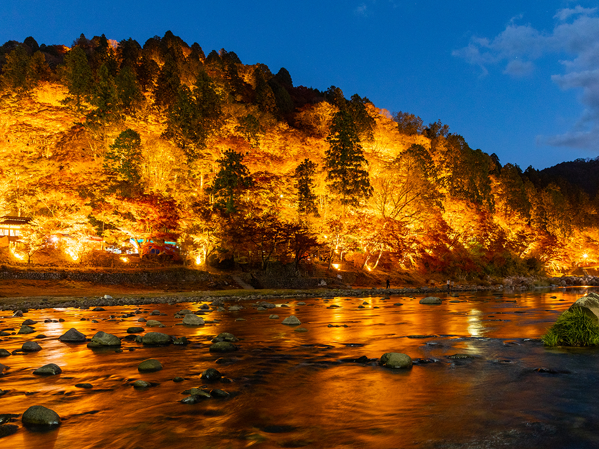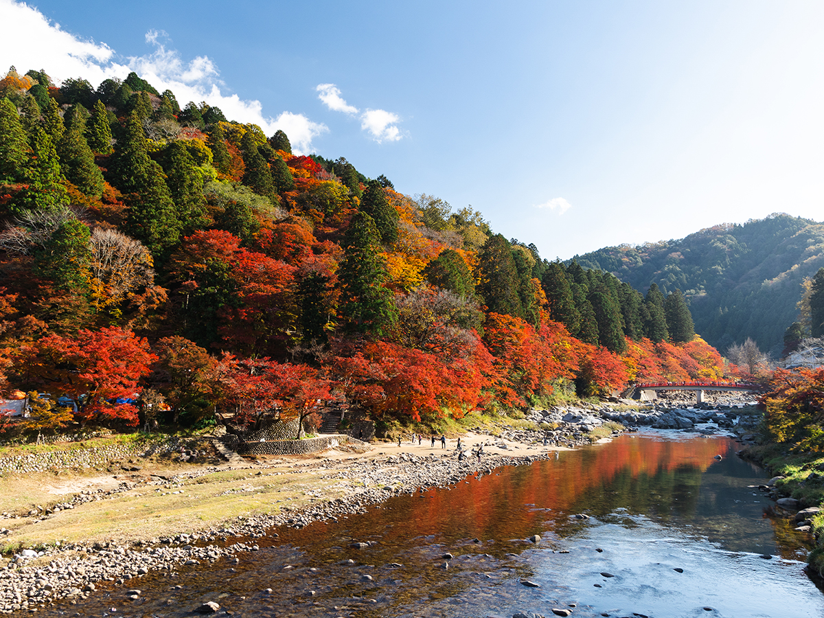 四季景色不同的香岚溪。秋季约4千棵树木染成红色、黄色,倒映在巴川上,将水面装点成彩色,非常美丽。11月1日到30日的“香岚溪红叶节”上,除了举办各种各样的活动,从日落到21点还有夜间亮灯,呈现出与白天不同的梦幻红叶美景。