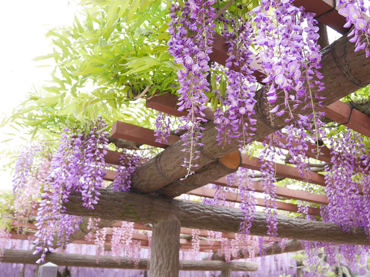 紫色的藤花在黄金周正好可以迎来最佳观赏期。小小的蝴蝶状花朵开得密密麻麻,穗状花序像瀑布一样低垂。为此,藤花名地都特意用竹竿或木头搭建藤棚,将藤蔓缠在藤棚上,方便大家观赏。藤花的花语是“欢迎”和“陶醉”。据说是从一边赏藤花一边喝酒非常优雅而来的词汇…不管藤花怎么美,观赏的时候一定不要喝醉哦。