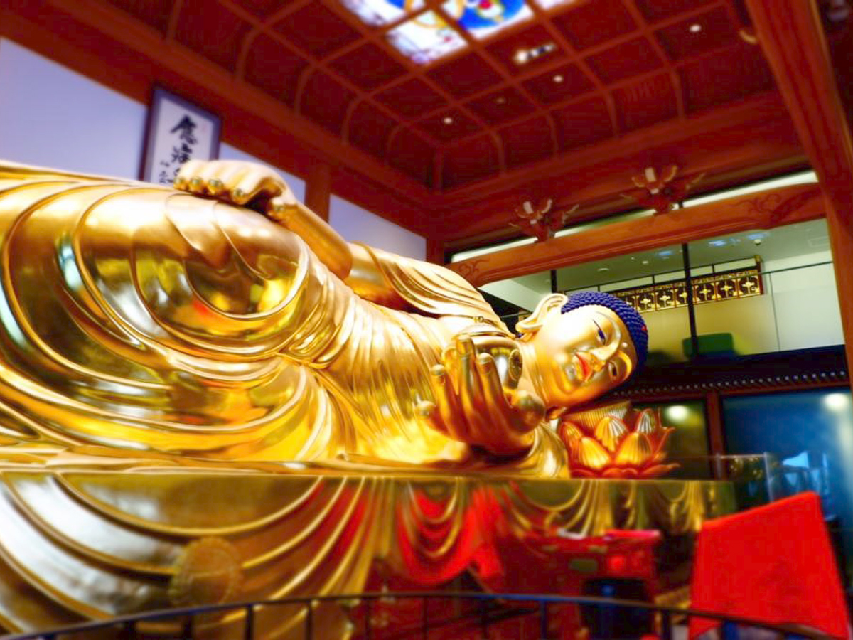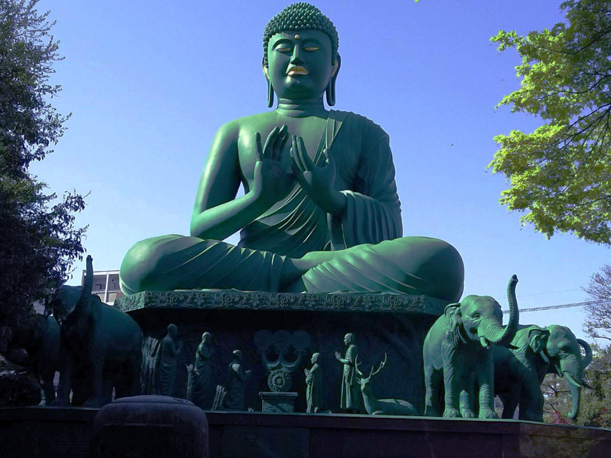大多数佛像由荷花支撑,这尊大佛却不同——高达15米的大青铜佛由数头大象支撑着。佛像青铜色的脸庞安详地望着寺庙外旷野上郁郁葱葱的植被,这与周围名古屋的现代建筑相映成趣。