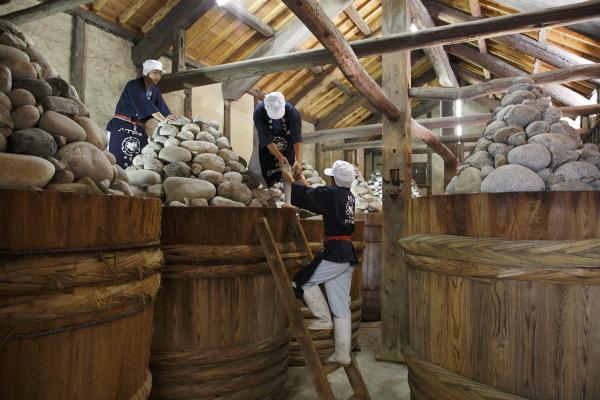 这里随时接受工厂参观,在温馨的氛围中,导游带领大家游览制造所。最有震撼力的是历经岁月洗礼的味噌桶林立的样子。将重约3吨的石块向上稳稳堆成圆锥形是工匠的手艺,听说堆石工匠要独当一面需要花费好几年的时间。