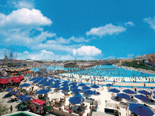 夏季变身为拥有海浪高达1m的海浪泳池、穿过拉格娜喜雅的桥和建筑・全长约230m的流动泳池、长约100m的水上滑梯的水上乐园!冬季则变身为水和光影打造出闪耀梦幻世界的灯光秀小镇。