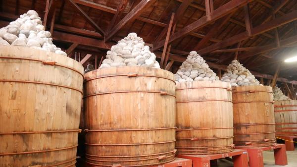 框久的“八丁味噌”,仅以大豆和盐为原料,装入大木桶中,工匠在上面将天然河石堆成金字塔形状,这种状态保持两冬两夏(2年以上),慢慢熟成。