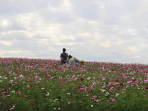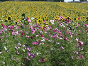 在观光农园花卉广场可以欣赏到大片的向日葵和波斯菊同框竞艳的美丽景观。 粉红色和黄色互相映衬,分外养眼,欢迎前来观赏。