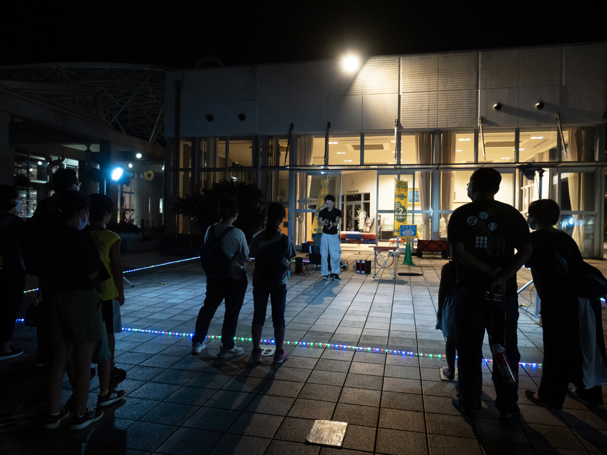 ▲夜の大道芸では、マスクなしのパフォーマンスでも飛沫が飛ばないよう、通常より広めに囲いを作り、その中で技を披露しています。パフォーマーは演技の途中で、「グループごとで、距離を開けて観るように」と何度もアナウンスしていました。