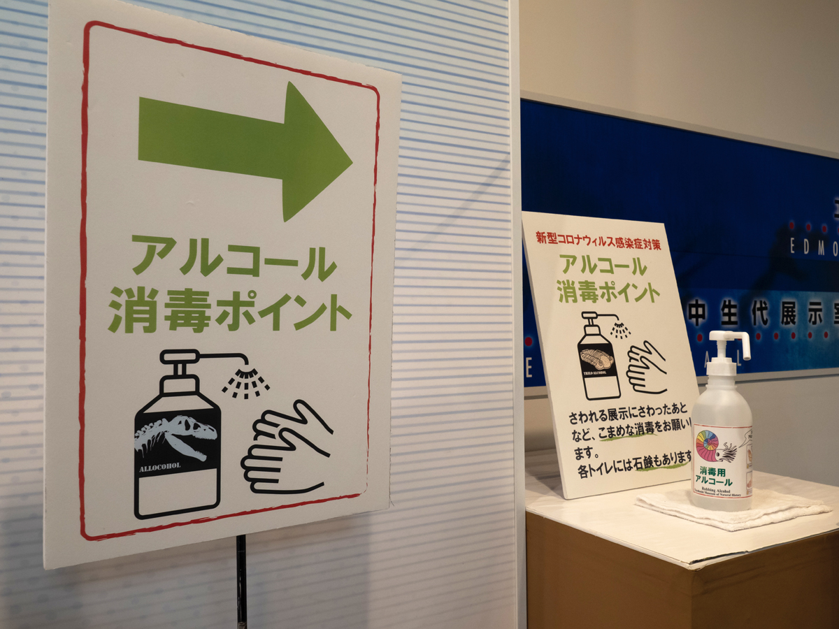 ▲自然史博物館では、触って体感してもらうことを目的とした実物展示が多くみられます。感染対策のために、単に展示を中止するのではなく、そのぶんアルコール消毒スポットを多く設置して対応しています。
