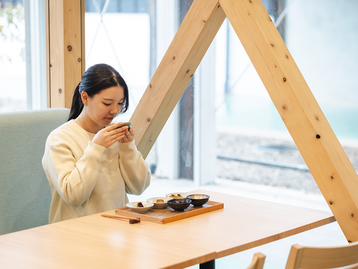 「カフェでは、旬の料理と、それに合うお酒をお楽しみいただけます。たとえば、和牛ソースの和牛ハンバーグには、純粋な旨みと酸を感じられる『純米大吟醸 無濾過生原酒』を。この地域の味噌やたまりしょうゆを使った料理には、うまみがしっかりとして、とろみのある『特別純米 無濾過生原酒』を。お酒自体もそれぞれ個性があっておいしいのですが、食と合わせることで味わいや香り、楽しみ方が何倍にも広がります」
