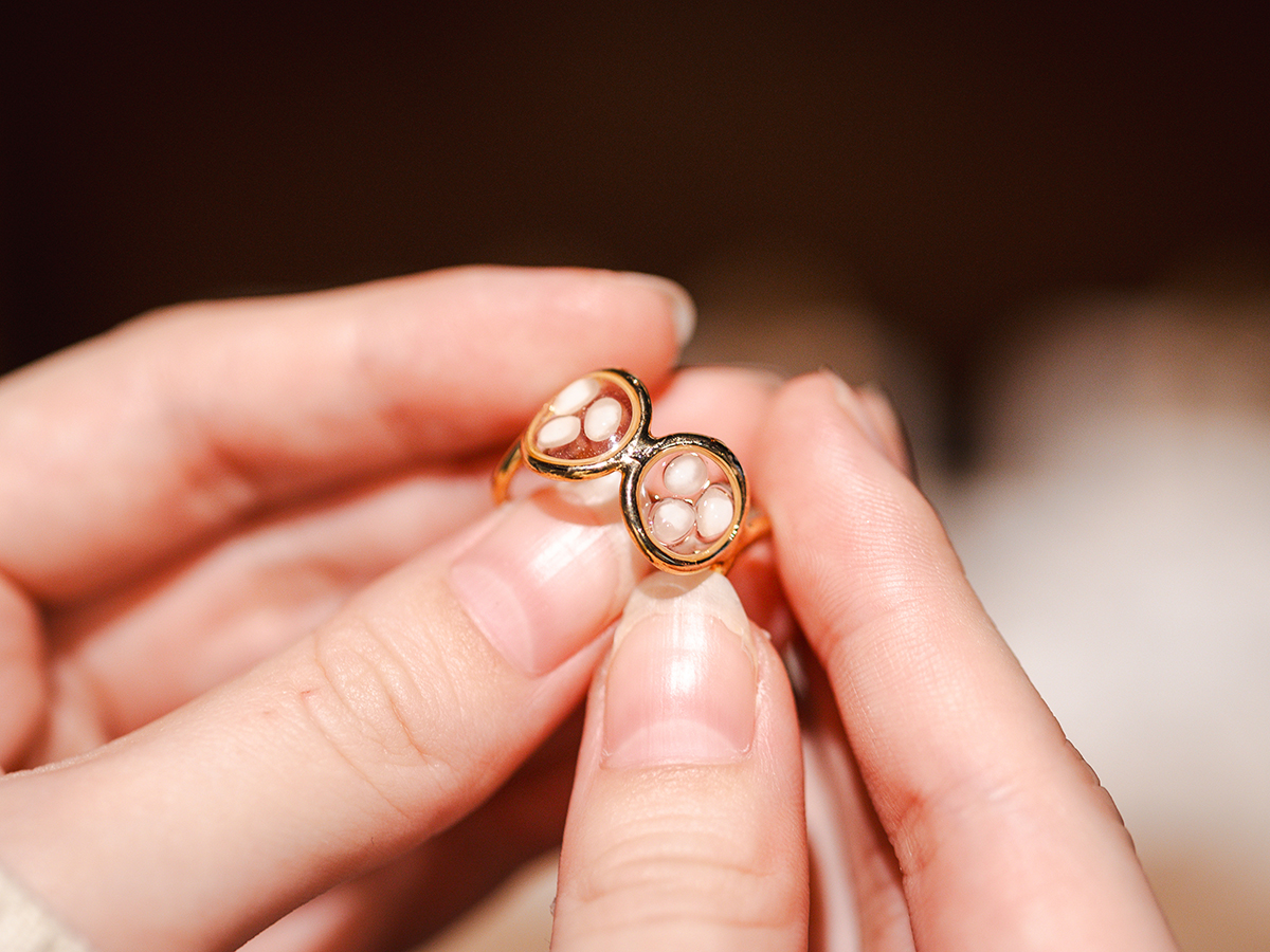 ピアス、ネックレス、リングなど、かわいらしいアクセサリーに使われているのは、なんと酒米! ハンドメイドで一点一点、丁寧に制作されています。