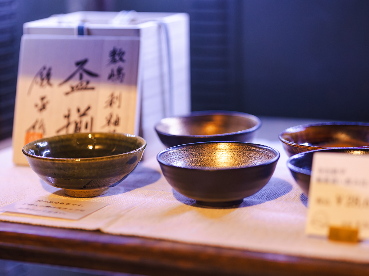 日本酒をより味わい深くしてくれる、美しい酒器も購入することができます。ちなみに、酒器をディスプレイする重厚な棚は、その昔、この場所が銀行だった時の金庫を利用したもの。