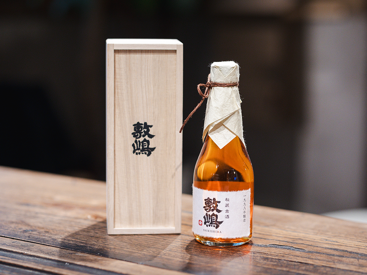 琥珀色をしたこちらのお酒は、敷嶋の秘蔵古酒。2000年、酒蔵を畳む際に売却したお酒が長野県の酒蔵に残されており、復活にあたって買い戻した。敷嶋 古酒(桐箱入り)7,000円 ※かめくち限定品、なくなり次第終了
