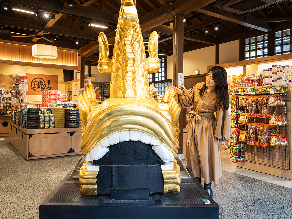 金のシャチホコが鎮座する土産どころ。シャチホコは名古屋城の実物と同じ大きさで、近くで見ると迫力満点! 旅の思い出として人気のフォトスポットになっています。