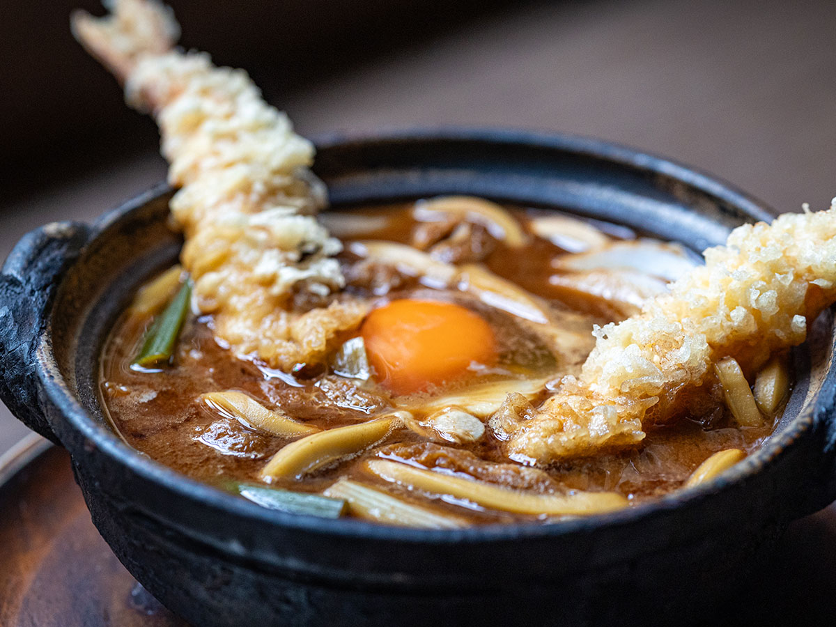 大正14年の創業以来、伝統の味を守り続ける味噌煮込みうどん。土鍋のふたを開けると、グツグツ煮込まれた味噌の香りが広がります。そそり立つ2本の海老天を名古屋城のシャチホコに見立てた「金シャチ煮込うどん」は、金シャチ横丁店限定!