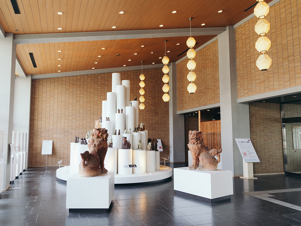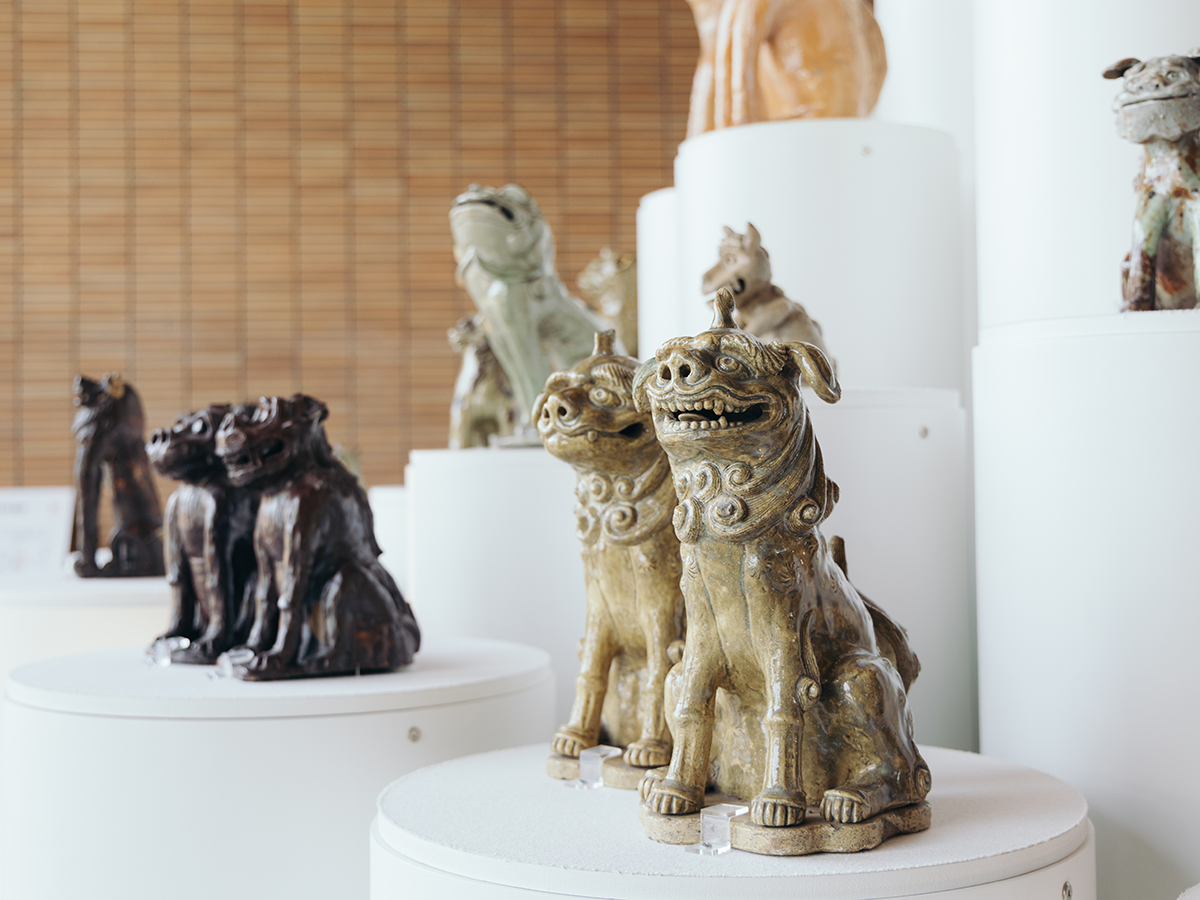 本館1階ホールで最初に出迎えてくれるのが、陶器で作られた狛犬たち。「リ•デザイン•狛犬」と題された展示では、江戸時代後期を中心とした作品が、約80体展示されています。陶製狛犬は全国でも珍しい、瀬戸・美濃の貴重な文化財。さまざまな願いを込めて制作され、神社などに奉納されたそうです。