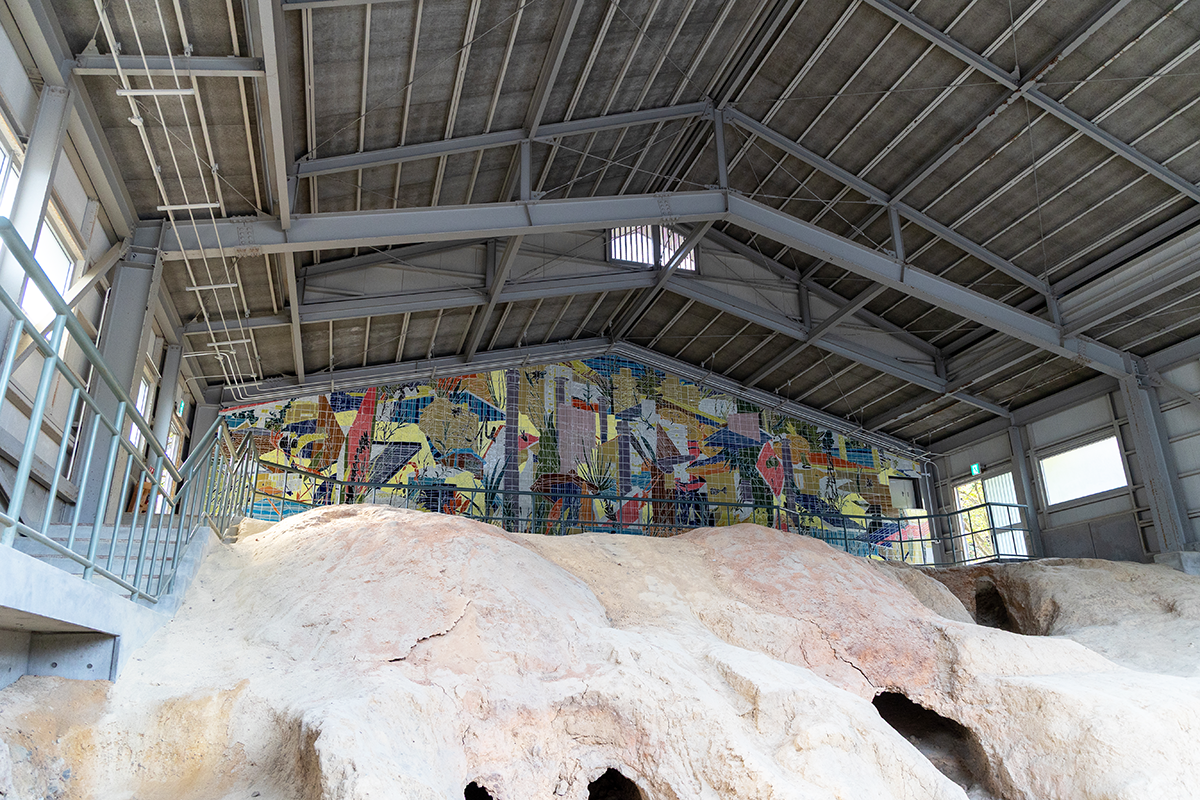 「つくるとこ!陶芸館」近くの「窯の記憶I・II」では、美術館敷地内で発掘された11~14世紀にやきものを焼いた窯跡が見学できます。中でも、「窯の記憶II」のダイナミックな窖窯(あながま)と、現代の瀬戸の風景が描かれたタイルの陶壁作品(《瀬戸風景2022》川田知志 2022年)は必見! 瀬戸の古代中世と現代が一つの空間に共存する、不思議な世界観に圧倒されるはず。