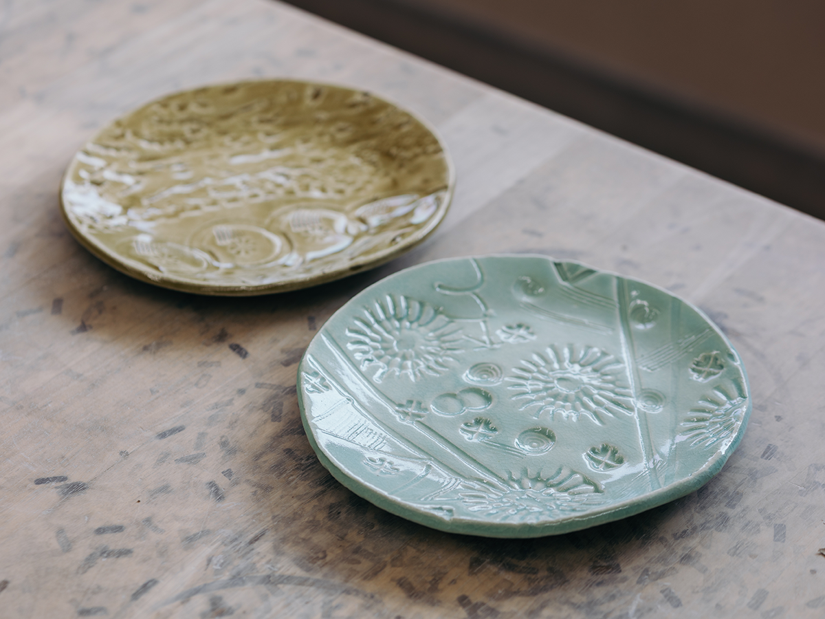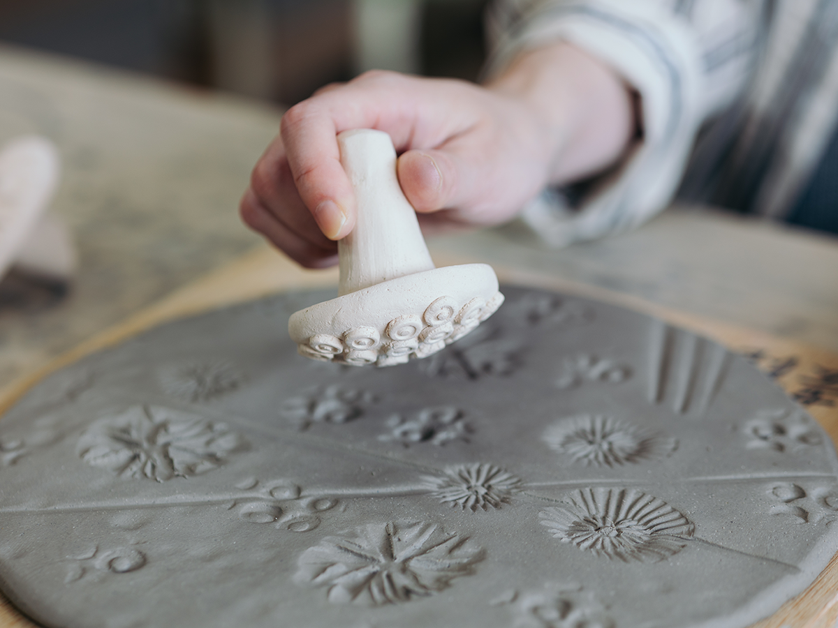 下の写真は、「印花皿(いんかざら)」の体験の様子(ワークショップの一例)。粘土板に、陶製のスタンプを押したり線をつけたりして模様をつける手法のひとつで、陶芸指導員さん曰く、コツは「頭を空っぽにして落書きを楽しむ」こと。スタンプを押すたびに様々な模様が表れて、思わず夢中になれちゃいます!