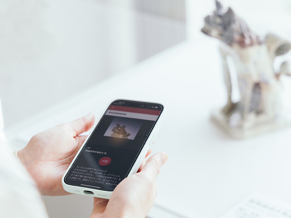 リニューアルに伴い、新たにガイドアプリ「ポケット学芸員」が導入されました。スマホでアプリをダウンロードし、作品番号を入力すると、解説を耳で聞きながら作品を鑑賞することができます。アプリの利用は無料で、通信には館内Wi-Fiが利用可能。展示ではわからない、別角度の画像なども見ることができます。