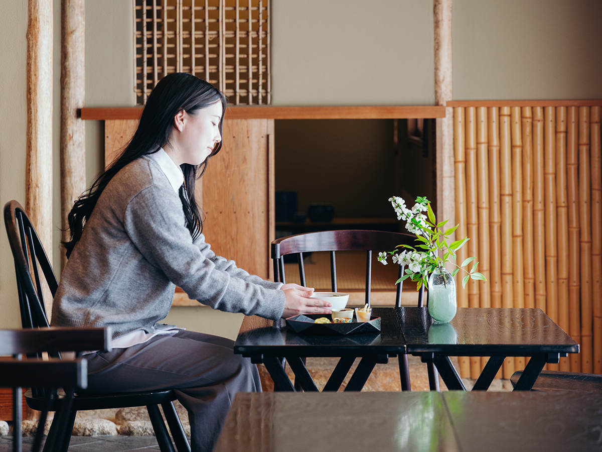 展示見学や体験後には、敷地内の茶室「陶翠庵」で一息つきましょう。季節の植物が彩るアプローチを進み、入り口を開けると、にじり口のある茶室とテーブル席を備えた和モダンな空間が広がります。茶室と聞くと少々敷居が高く感じられるかもしれませんが、リニューアル(2025年5月2日オープン)で、喫茶と器をより気軽に楽しめる場に生まれ変わりました。