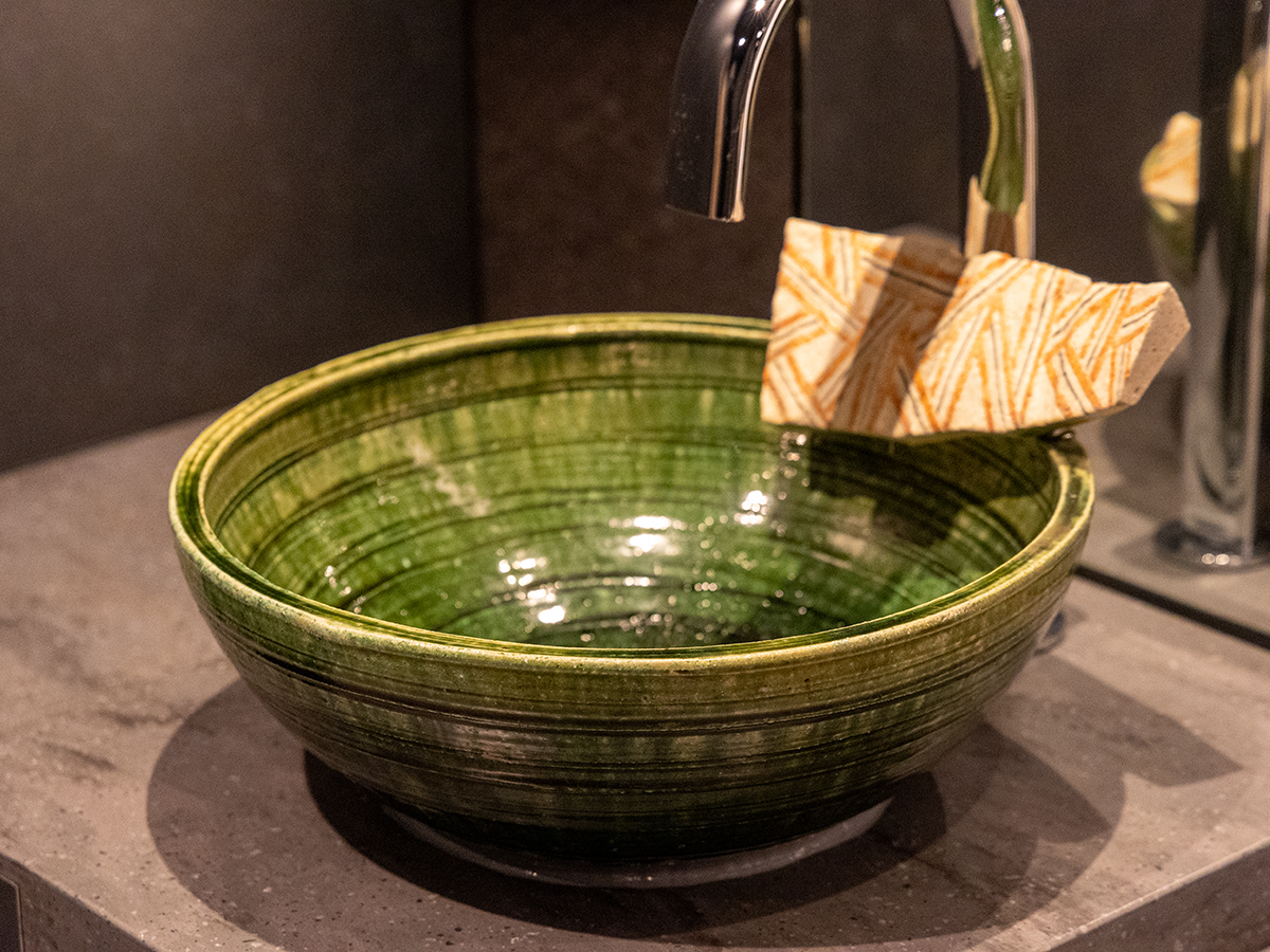 本館1階では、リニューアルしたトイレにも立ち寄りましょう。ここでは、瀬戸・常滑の陶芸作家が制作した洗面鉢に注目を。優美な植物が描かれた作品や、鉢に陶片がくっついたような遊び心ある作品など、それぞれに陶芸作家の個性が光ります。どこで手を洗おうか迷ってしまいそう♪