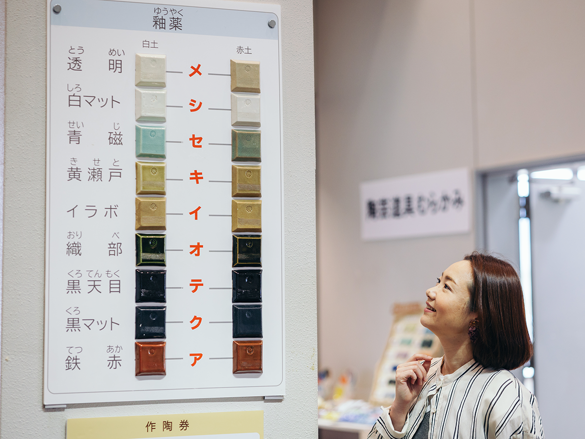 カップの形ができたら、その後の素焼き、釉がけ、焼き上げの工程は陶芸指導員さんにバトンタッチ。釉薬は美術館オリジナルの9種類の色合いから選ぶことができます。