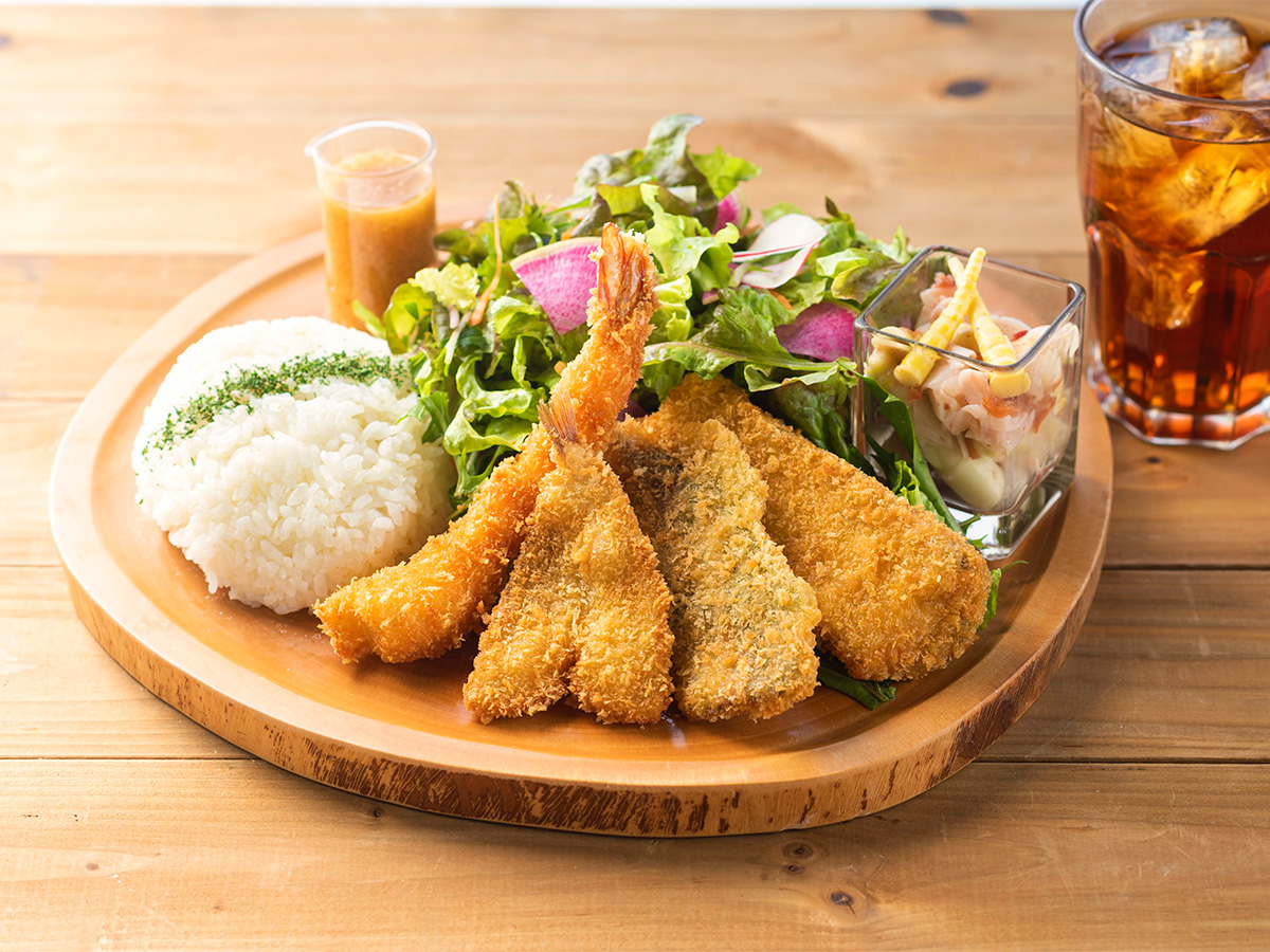 ジャンボエビフライ発祥と称される「まるは食堂」が運営しており、名物のエビフライを始め、定食や海鮮丼、オリジナルメニューのごんぎつねうどんも大人気!