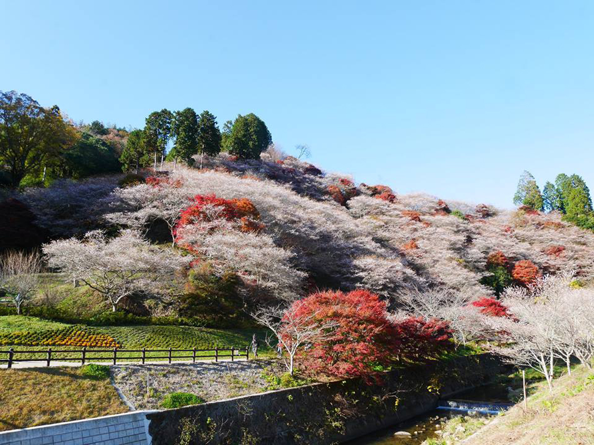 02春と秋に花を咲かせる四季桜が山肌をおおい、秋には桜と紅葉の共演が見もの。川の両岸に四季桜と紅葉が続く遊歩道も整備している。