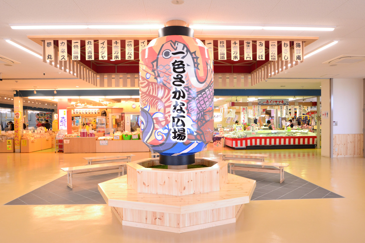 3三河湾に面し、一色漁港に隣接する海鮮市場。一色漁港で水揚げされた魚介類や、うなぎ・えびせんべい・果物など一色町の特産品の店が軒を連ねます。新鮮で美味しい海の幸をお値打ちに買えるとあって、休日には多くの人で賑わっています。