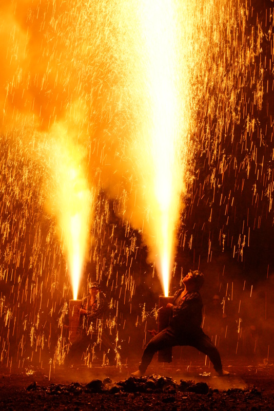 Hand-held fireworks, or "tezutsu hanabi," are bamboo tubes stuffed with gunpowder and carried under the arm as they send showers of sparks raining down on the people holding them. Great pillars of fire that can't be seen on such magnificent a scale elsewhere are blown 10 meters up into the air! Feel the power and energy of the hand-held fireworks accompanied by soul-stirring Japanese drumming at the Fire Festival in Toyohashi, the home of hand-held fireworks.