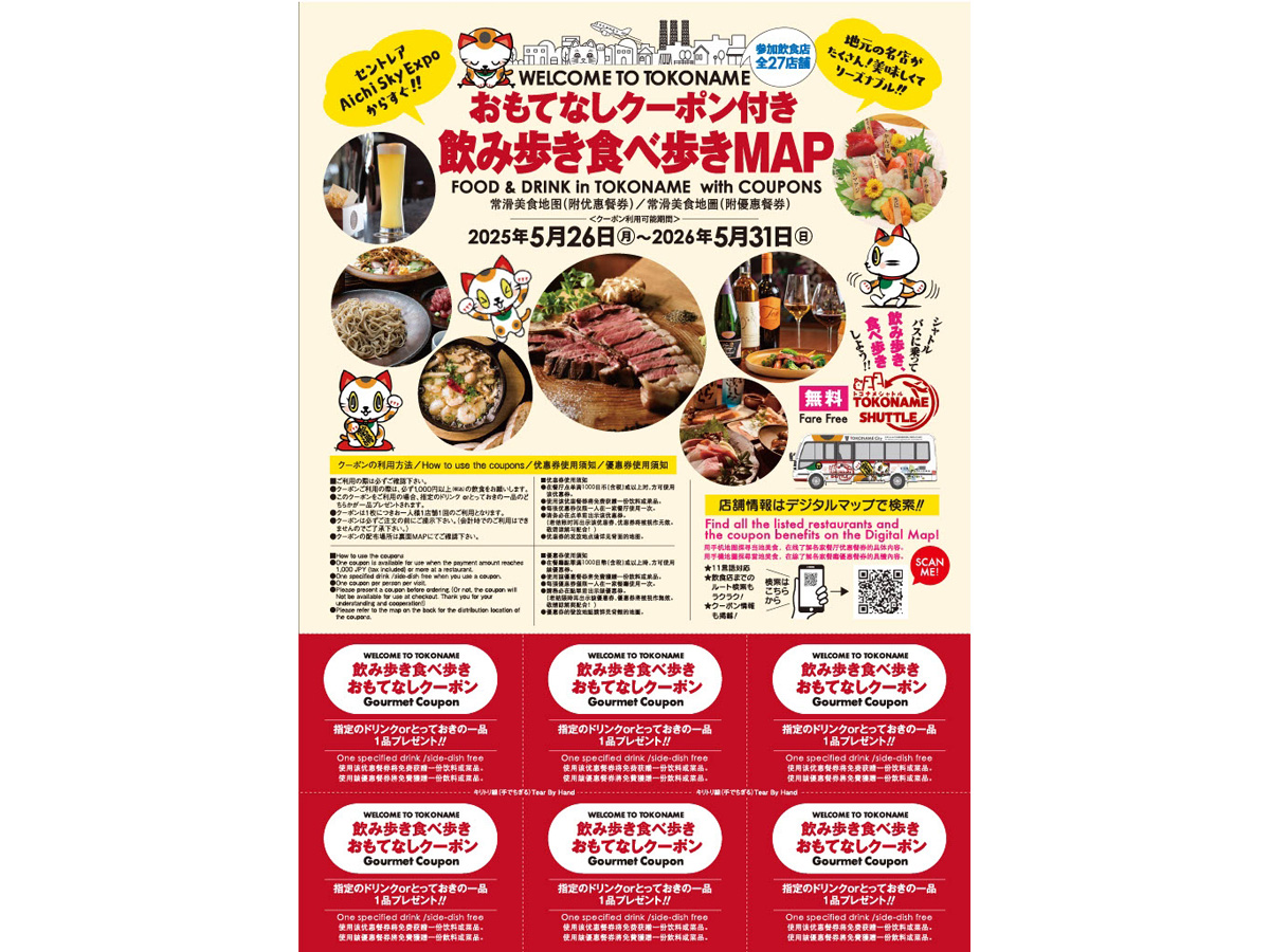 1月1日~5月31日まで 「WELCOME TO TOKONAME おもてなしクーポン付き 飲み歩き食べ歩きMAP」に記載の27店舗 常滑市鯉江本町周辺 ※ アクセスマップは名鉄常滑駅を示しています |