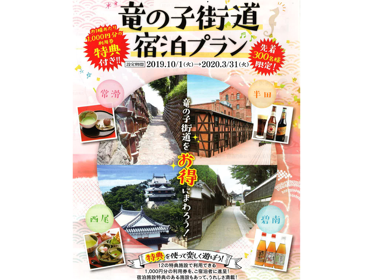 2019年10月01日 ~ 2020年03月31日【先着300名様限定!】 常滑市、半田市、碧南市、西尾市 西尾市寄住町下田22番地 ※ アクセスマップは「竜の子街道広域観光推進協議会 事務局」を指しています |