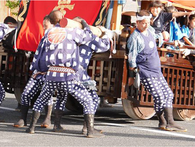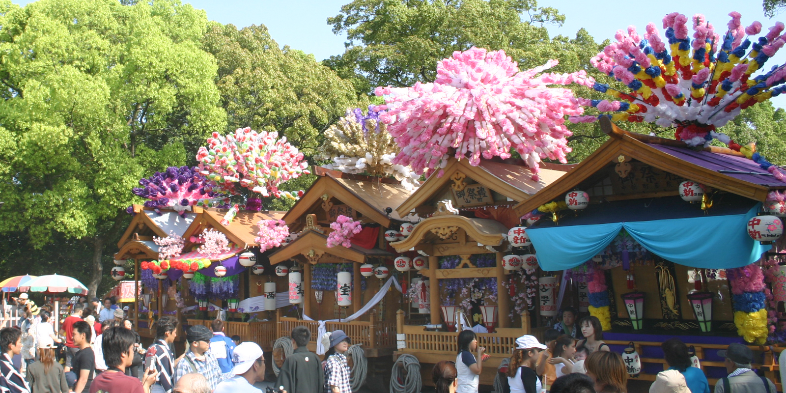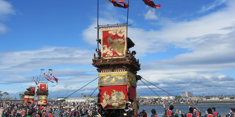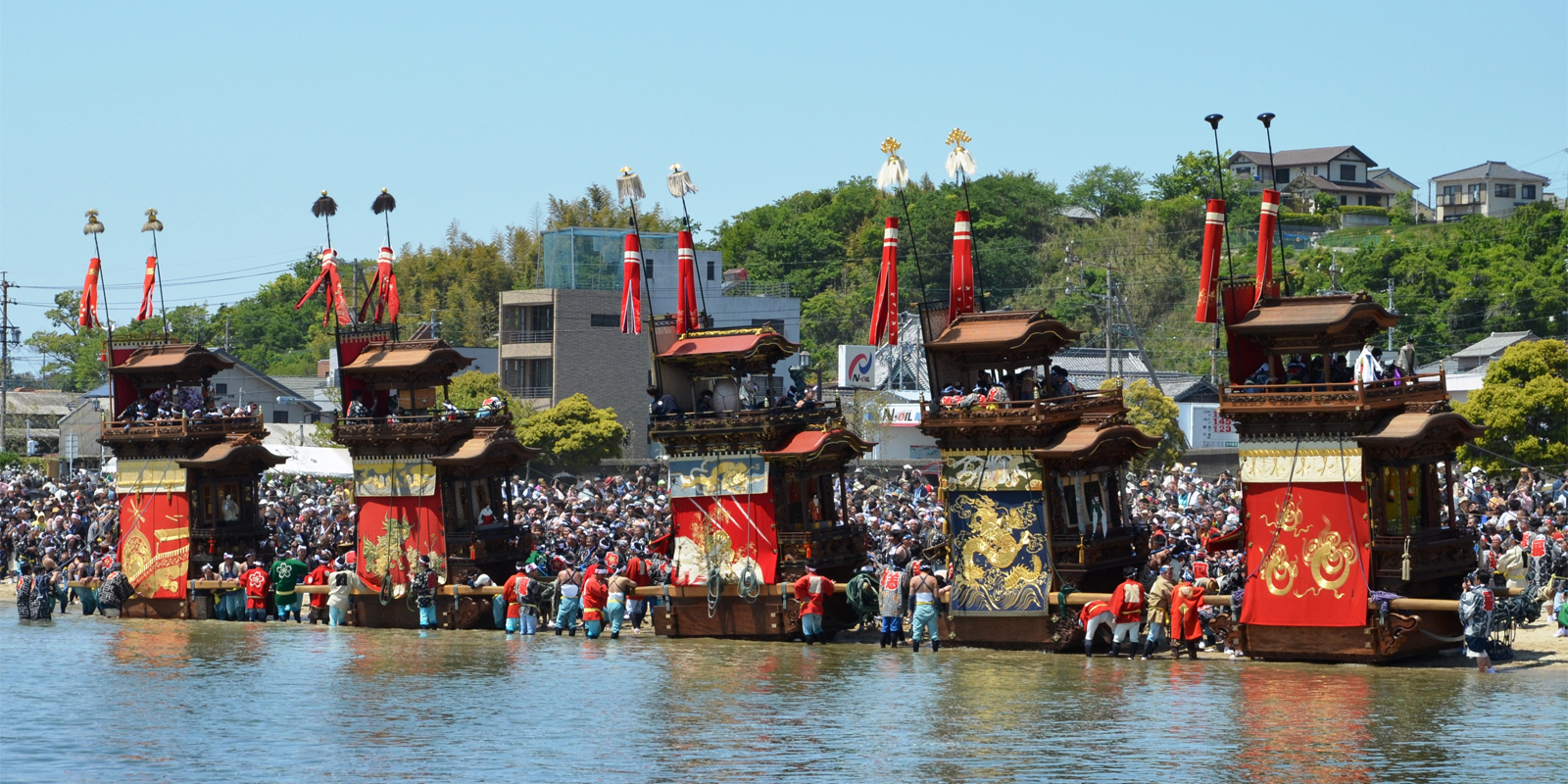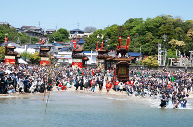 神武天皇がこの地に上陸したとの伝説にちなんだ神前神社の祭礼。幕末の工芸文化の粋を集めて造られた 5 輌の山車が干潮の浜辺へ曳き下ろされる姿は見ものです。からくり人形奉納、綱さばきと楫とりの妙技も見所のひとつです。