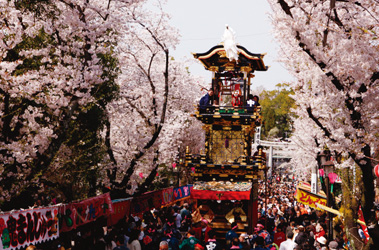 毎年桜の季節に行われる犬山祭の主役は三層からなる豪華な「車山(やま)」。車山の上では江戸時代から伝わるからくり人形が操られ、様々な演技が奉納されています。夜には車山に飾られた提灯に灯りが灯され、夜桜の下を巡行。美しき夢幻の世界が広がります。