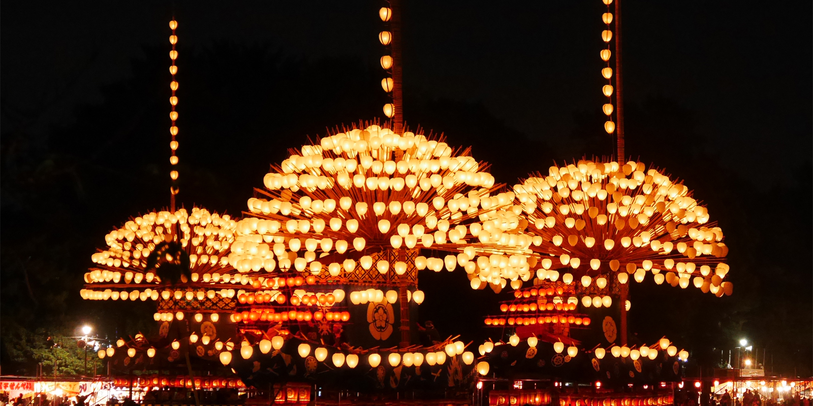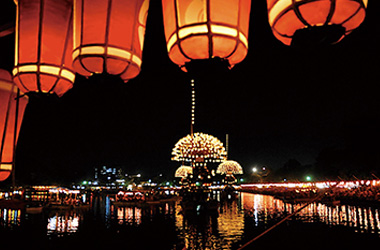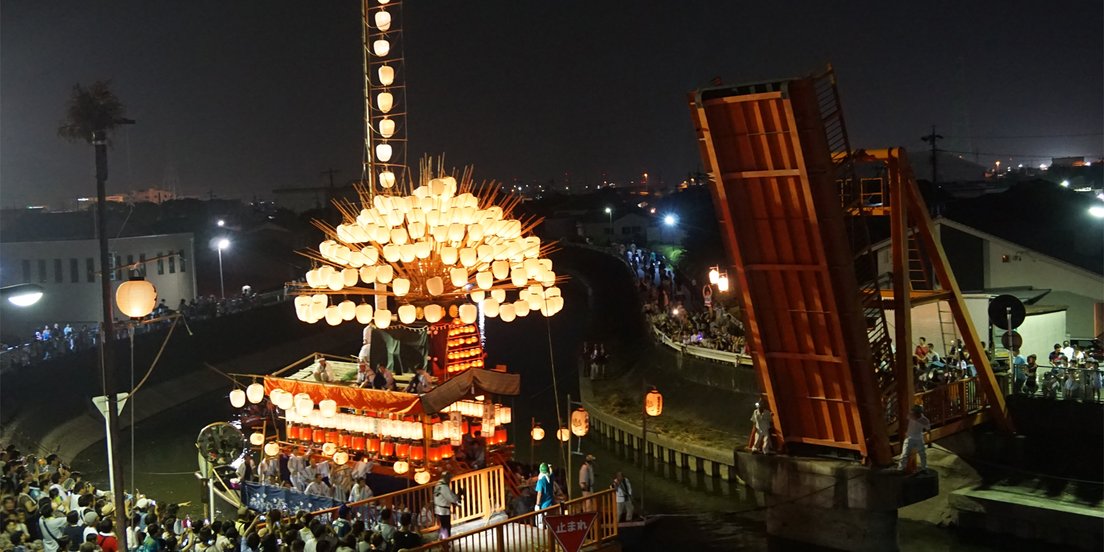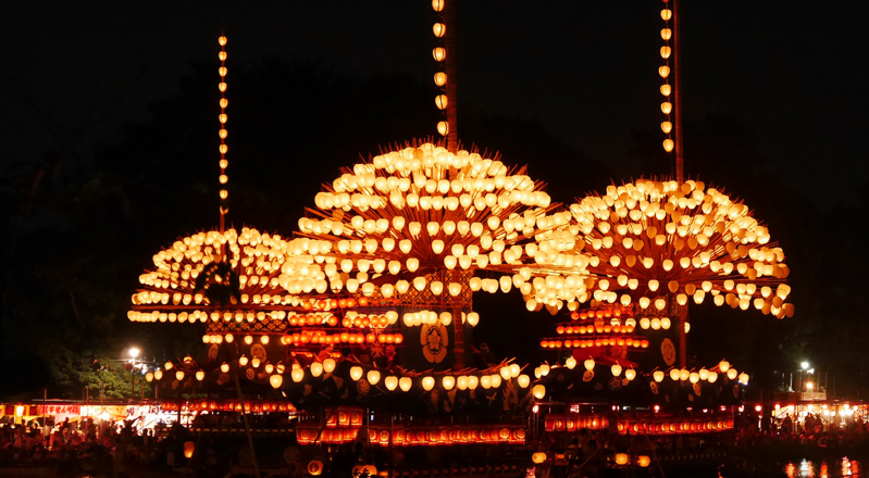 日本三大川まつりのひとつで、津島神社の祭礼として600年近くの歴史があります。宵祭では提灯に彩られた津島五車と呼ばれる5つの車楽が提灯を灯しながら天王川に浮かび、津島笛を奏でながら漕ぎ渡ります。朝祭では市江車が加わり、鉾を持った10 人の青年が市江車から天王川に飛び込み、神社まで疾走します。