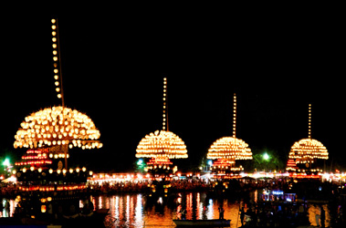まきわら船に飾り付けられたたくさんの提灯。これら一つひとつにも意味があります。まっすぐ上に伸びる提灯は1年=12か月にちなみ12個、その下の半球型は1年=365日の意味があるものの、形がきれいにならないので実際は400~420個ほどだとか。また、お稚児さんが座るあたりの赤い提灯は、1か月=30日にちなんで30個ついています。提灯をつけていく様子は職人技でとても素晴らしいのでぜひ見てください!また、その間にも水上花火や打上花火など様々なイベントが行われ、楽しみのひとつです。