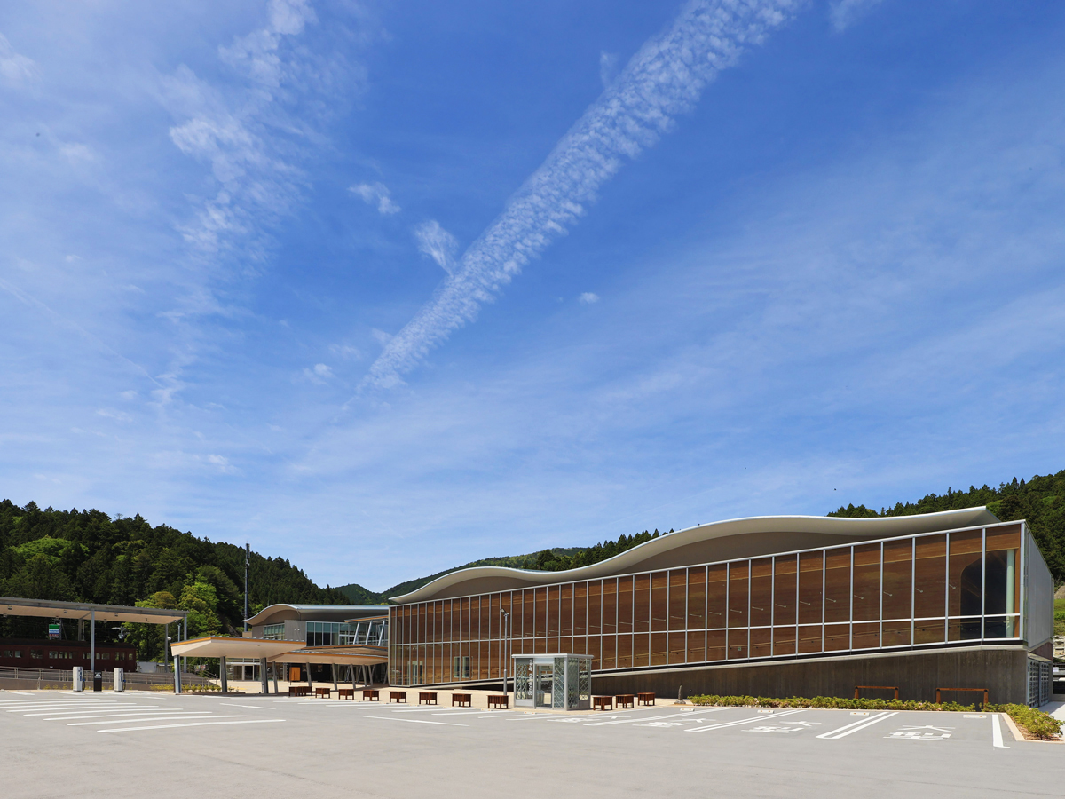 奥三河の木材を使用したアーチ屋根が特徴の施設には、地元産品を扱う直売所等があります。