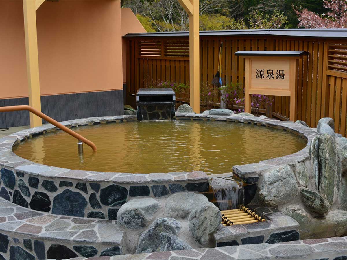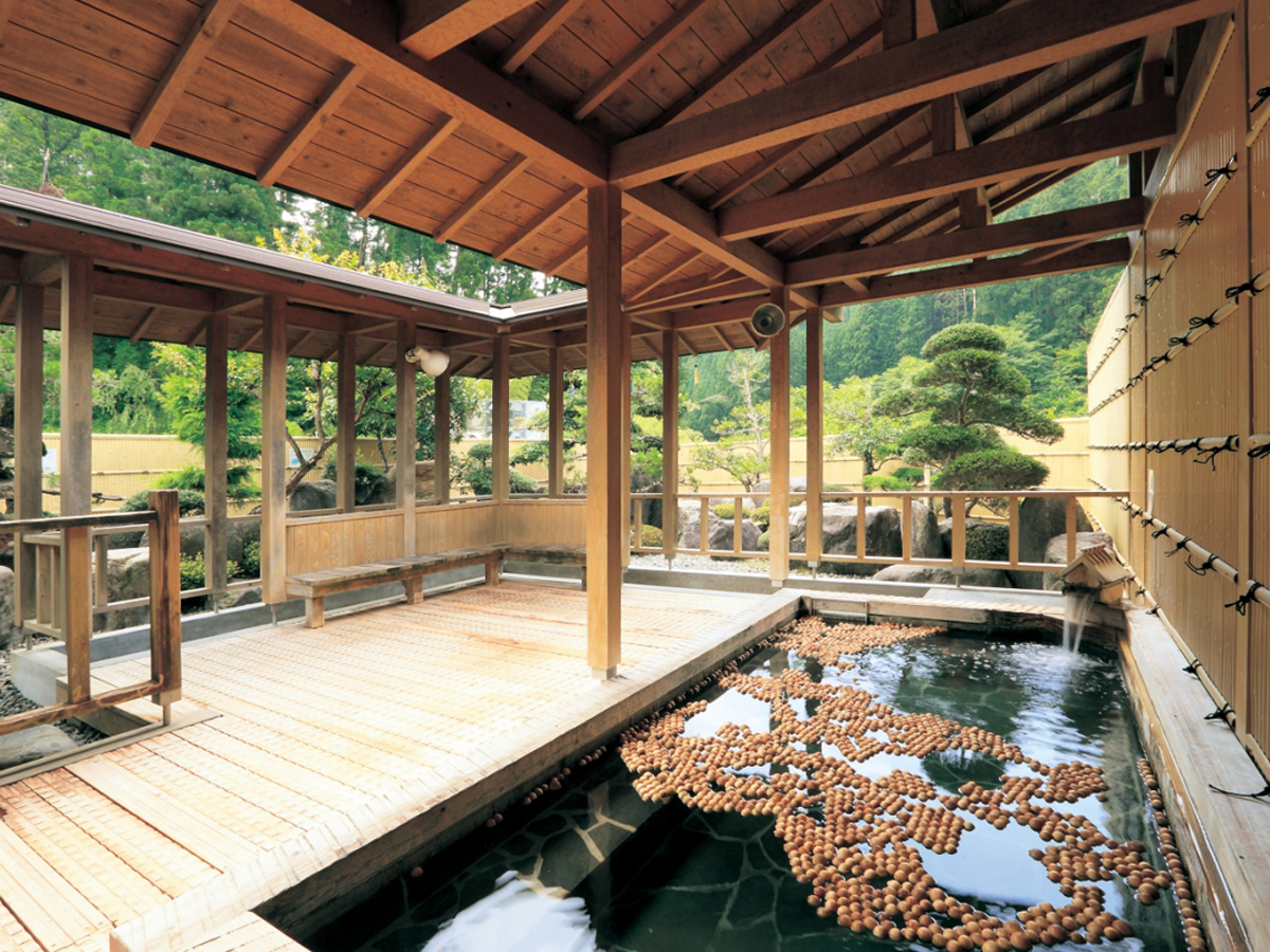 東栄町の日帰り温泉施設「とうえい温泉花まつりの湯」。湯量が豊富で、近くを流れる大千瀬川の瀬音を聞きながら多彩な趣向を凝らした入浴を楽しむことができます。天然療養泉で、体を芯から温め冷ましにくいことから「熱の湯」とも呼ばれています。