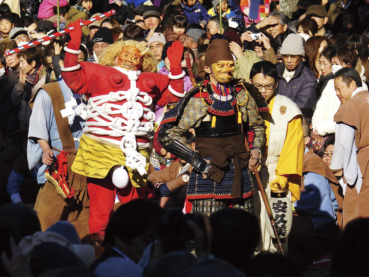 祭礼は2日間行われ、氏子14町会によって神楽・田楽・歩射(ぶしゃ)・卜占(ぼくせん)・御神幸など様々な行事が行われますが、中でも「天狗と赤鬼のからかい」が有名です。これは荒ぶる神である赤鬼と武神天狗が秘術を尽くして闘い、やがて敗れた赤鬼が償いにタンキリ飴と白い粉(小麦粉)をまきながら境外へ飛び去るというストーリー。この粉を浴び、飴を食べると厄除となり夏病みしないと言い伝えられています。