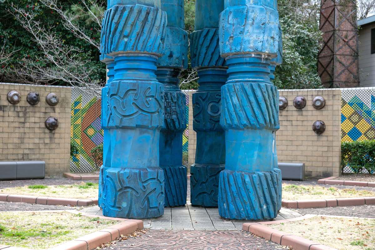 やきもの散歩道Aコースの中間地点にある「登窯広場」。園内にはやきもののモニュメントや登窯、展示工房館があり、展示工房館内では窯の見学や、常滑焼の絵つけ体験をすることができます。旅のお土産や、常滑焼作家さんの作品も取り扱っています。