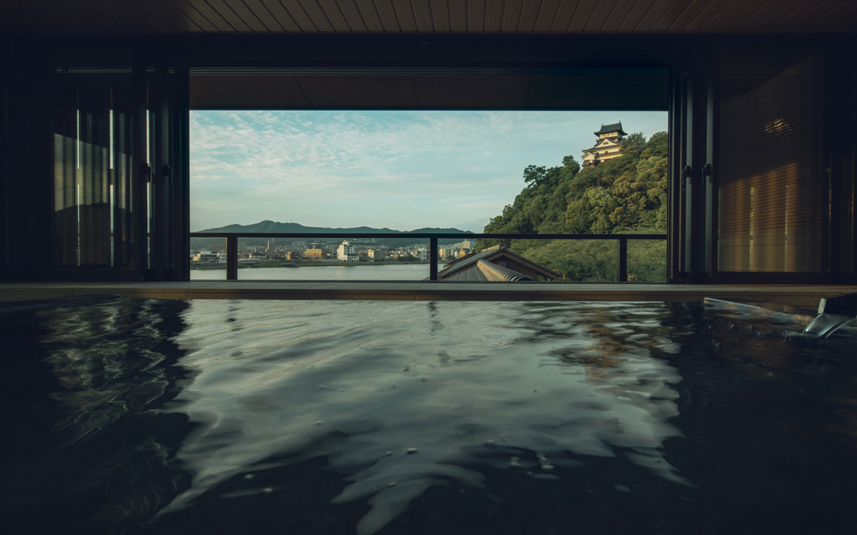 木曽川沿いに佇み、犬山城のふもとに位置する犬山最古の老舗宿「灯屋 迎帆楼(あかりや げいはんろう)」。全室が1日10組限定の半露天風呂付のスイートです。老舗ながらも現代的なデザインを取り入れ、近年リニューアルしました。客室の見晴らしのよい大きな窓からは、犬山城や木曽川をはじめ、犬山の美しい景色を一望できます。