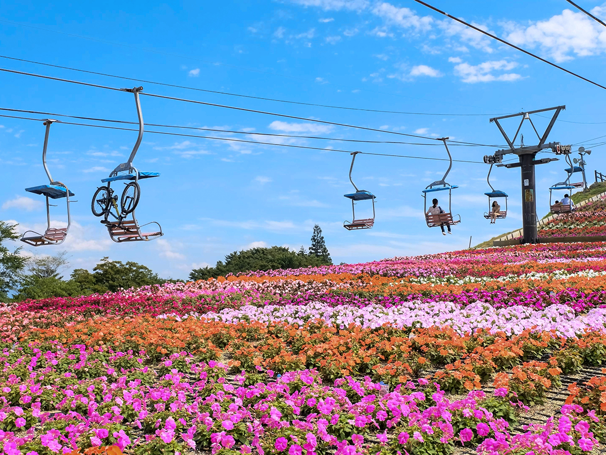 愛知県と長野県の境に位置し、標高1415メートルを誇る県下の最高峰、茶臼山。 5月上旬~6月中旬に咲く芝桜も有名ですが、萩太郎山に植栽するサンパチェンスが7月中旬~10月下旬まで楽しめ、観光リフトに乗りながら鑑賞することができます。